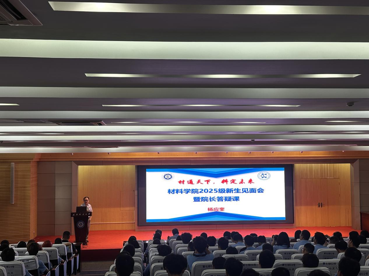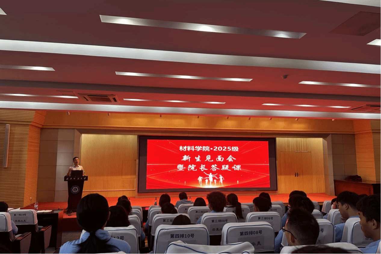 在院长答疑环节,杨应奎针对新生最关心的学业、科研、就业问题,进行“一对一”回答。针对“如何参与科研项目”,他介绍新生可以通过“本科生导师制”提前对接课题组,参与教师的科研项目;关于“专业分流的具体规则”,他回应新生将在第一学年后进行专业分流,材料科学与工程、高分子材料与工程、复合材料与工程等专业;现场提问氛围热烈,新生围绕“专业学习”“奖学金申请”“出国交流机会”等问题踊跃发言,学院老师结合政策细则与实例耐心解答,既消除了新生的迷茫,也让大家对大学生活的规划更具方向感。
