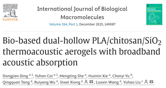 本科生丁东剑以第一作者在国际生物学领域权威期刊《International Journal of Biological Macromolecules》(中科院二区TOP)上发表了题为“Bio-based dual-hollow PLA/chitosan/SiO2 thermoacoustic aerogels with broadband acoustic absorption ”的学术论文。成人直播平台成人直播平台