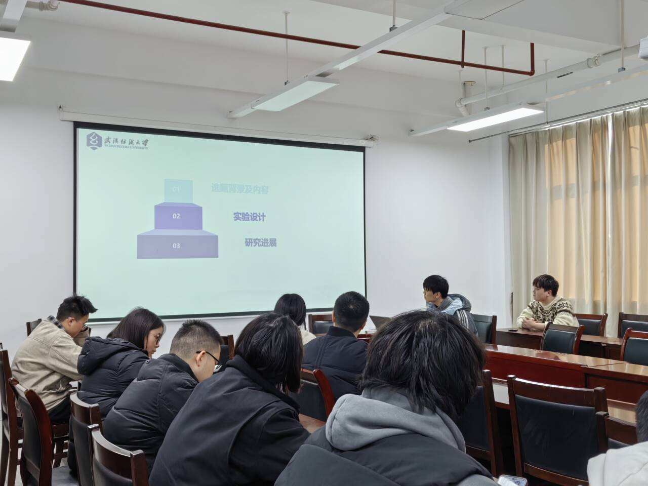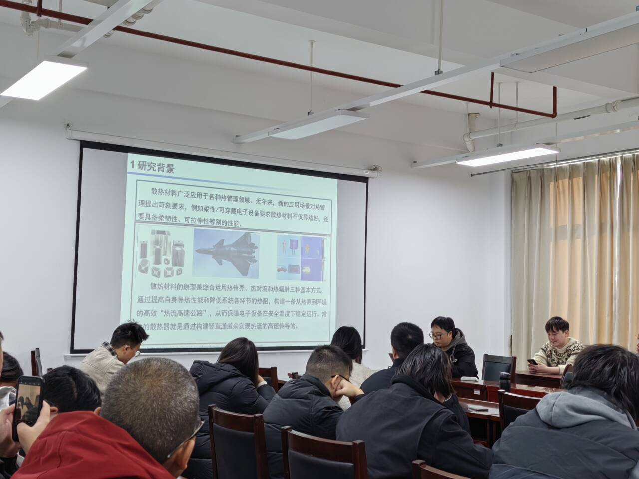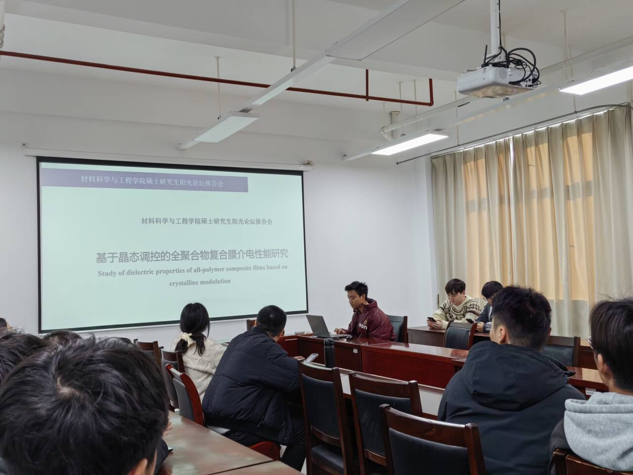 承办,杜玮、朱雨璇两位教师担任轮值主持。学院硕士研究生杨浩东、肖雨豪、丁瑞、李旭四位同学围绕“新材料的创新与应用”主题,依次汇报了最新科研进展,集中展示了学院在介电性能研究、光热转换复合材料、静电植绒结构构筑、光催化TiO2/g-C3N4异质结改性等方向的前沿探索成果。