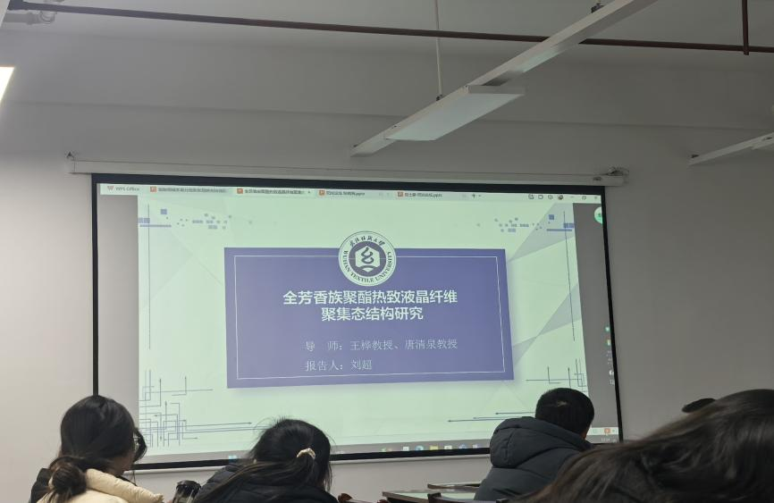 刘超同学在王桦教授、唐清泉教授指导下,围绕《全芳香族聚酯热致液晶纤维聚集态结构研究》展开汇报。热致液晶聚芳酯(TLCP)纤维作为高性能特种工程材料,广泛应用于航空航天、高频通讯等领域。研究团队探究不同温度(210℃-250℃)及升温速率(3.7℃/h-11℃/h)热处理对纤维结构性能的影响,发现温度升高或升温速率降低可显著提升纤维固相聚合度、熔点、结晶度及分子链缠结度,断裂强度最高达 25.44 cN/dtex,热稳定性大幅增强,明确了工艺 - 聚集态结构 - 性能的关联,为成型工艺优化提供重要指导。