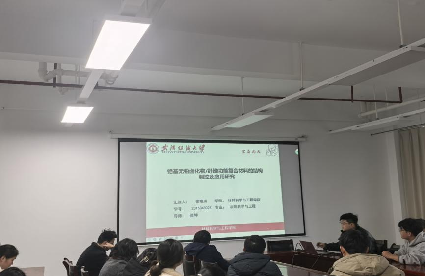 承办,张宏伟、刘洪涛两位老师担任轮值老师,学院研究生刘超、孙笠、赵士豪、张晓满四位同学分别围绕高性能纤维、阻燃材料、电极材料、发光材料等前沿方向展开汇报,全方位展现了学院在材料科学领域的创新突破与科研实力,为师生搭建了高质量的学术交流与成果转化平台。