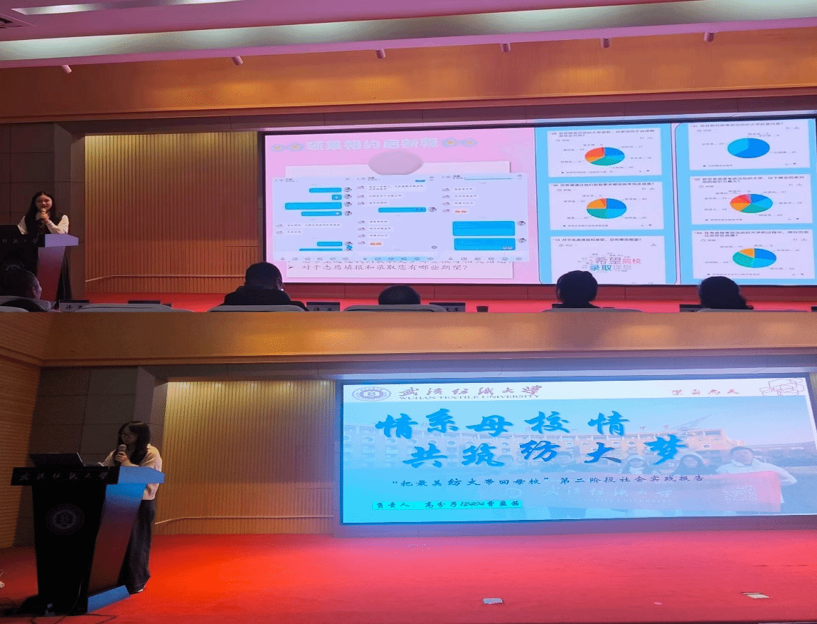 参赛团队通过实物展示、视频回顾、PPT讲解等方式,结合自身求学经历,从校园环境、学科建设、文化活动等方面展开讲述,展示了精彩的实践经历。在实践中,同学们开展了“纺大故事分享”、“专业特色解读”、“互动答疑交流”等活动,生动诠释了“崇真尚美”的校训精神,分享了团队在实践过程中的感悟与收获。